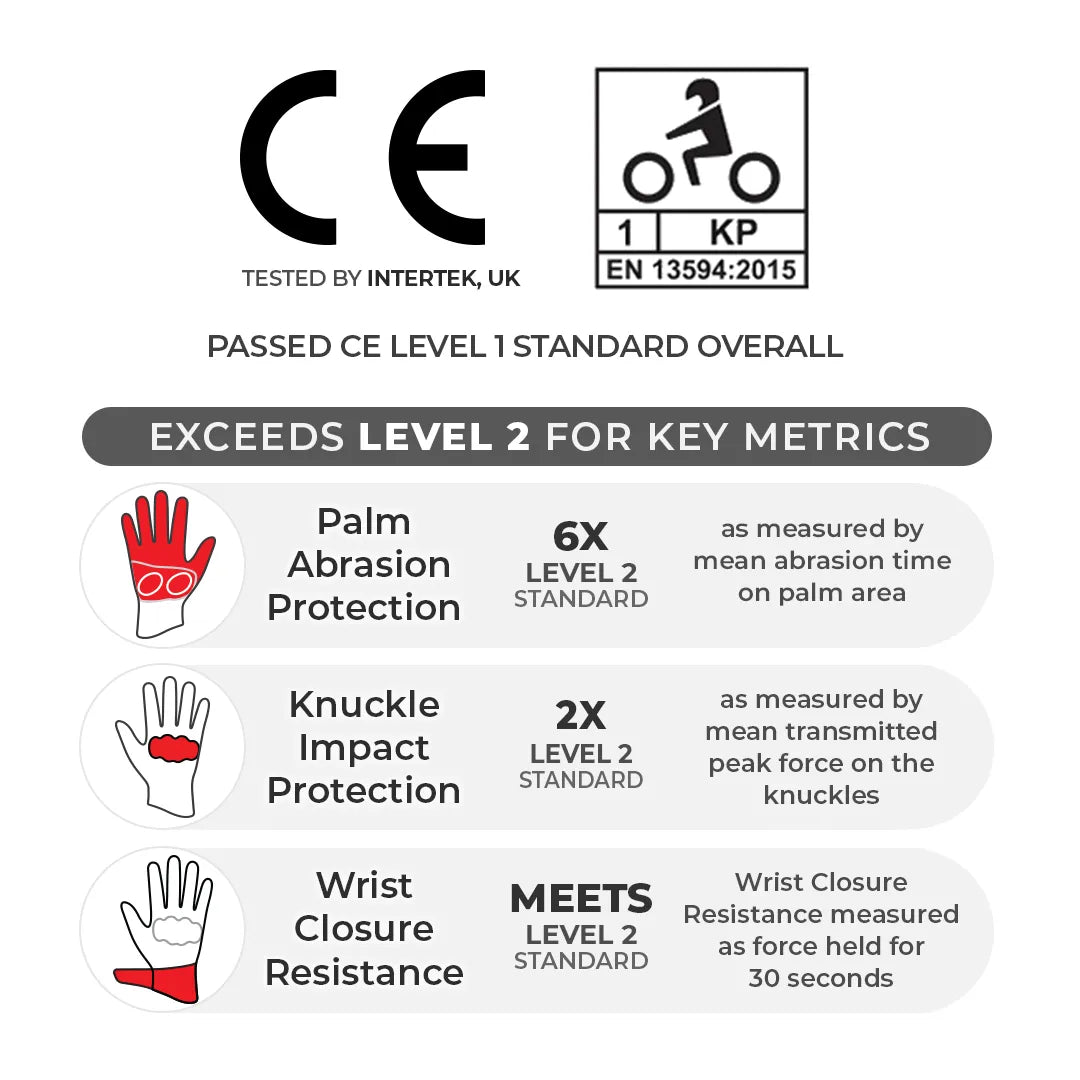 The Holeshot Pro is CE tested and confirmed to meet Level 1 requirements by Intertek UK. It also exceeds Level 1 or meets Level 2 requirements for restraint, impact abrasion resistance, and knuckle impact protection.