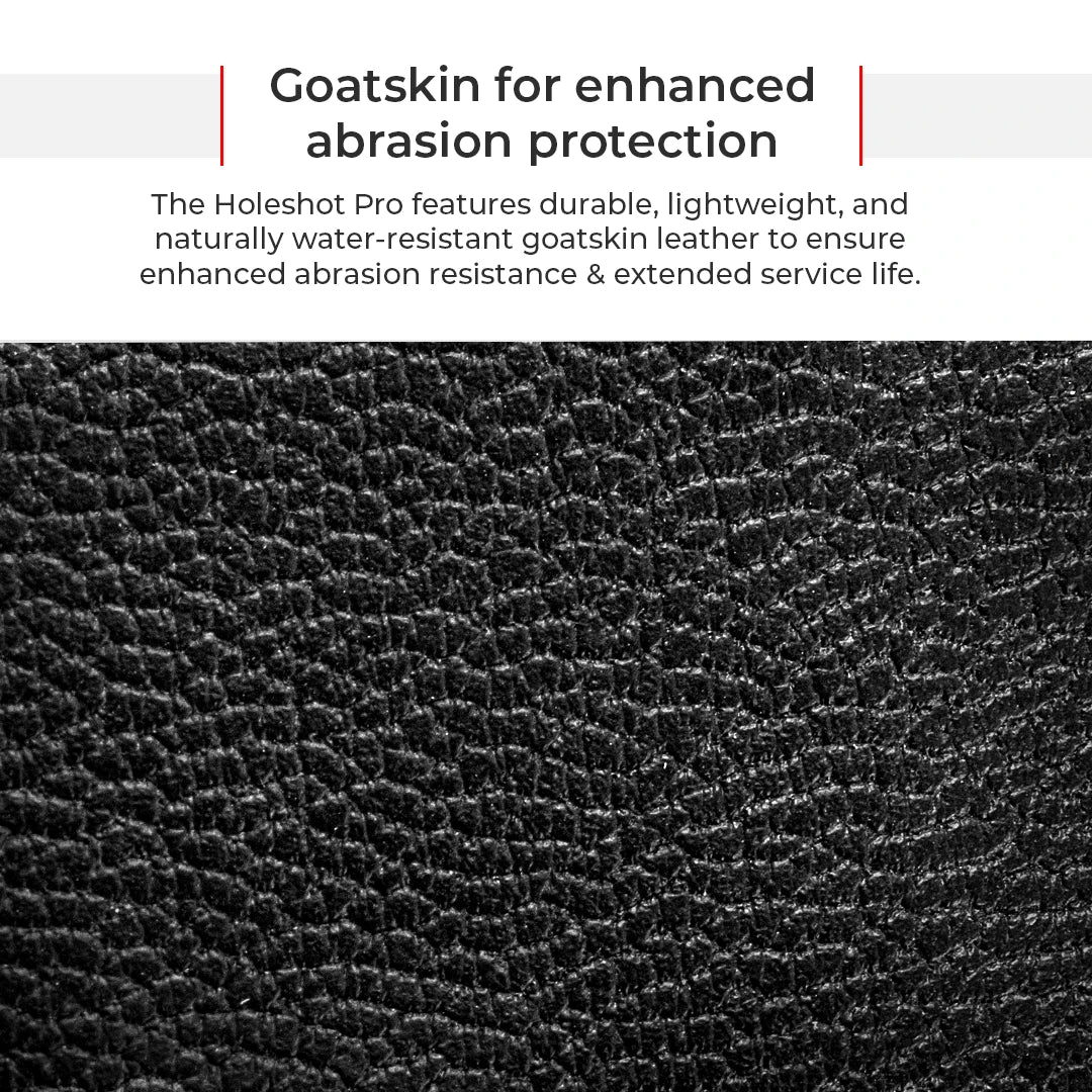 The HOLESHOT PRO utilizes durable, lightweight goat skin leather that is naturally water-resistant. The leather is intentionally kept as thick as possible to enhance abrasion resistance.